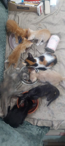 27.06.: 4 der Kleinsten interessieren sich schon für feines Katzenessen. Pepa wäre froh wenn die Milchfläschchen endlich der Vergangenheit angehören
