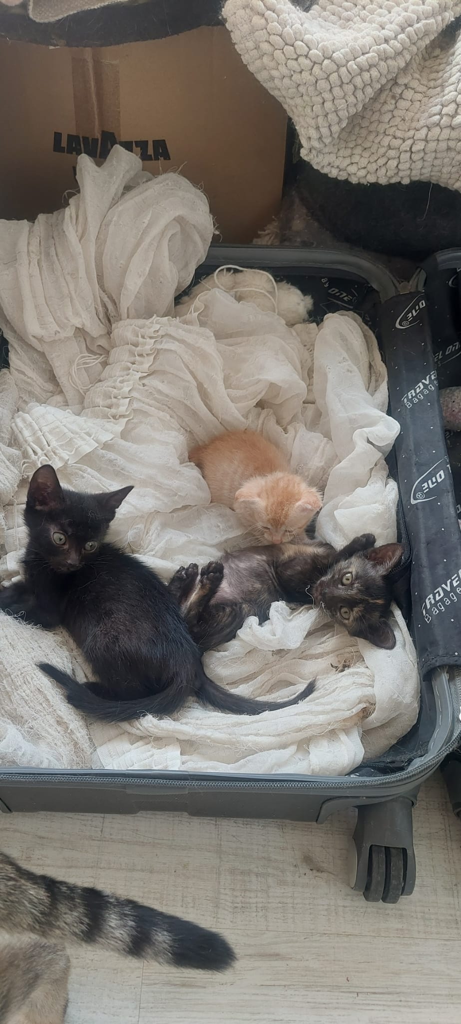 12.05.: Pepas Kittenbande hat Zuwachs bekommen ... letzten Freitag kommt sie von der Tierklinik und hört aus der Abfalltonne Kitten weinen ... nein, sagt sie sich, ich gehe da nicht hin, nein diesmal nicht ... Pepa ist nicht voll, nicht übervoll, sie platzt aus allen Nähten ... und geht doch hin und holt 2 Babies aus dem Müll raus. Die ersten 2 Tage müssen sie in der Box auf der Terrasse sein, dann kommen sie zu ihren Neuzugängen.