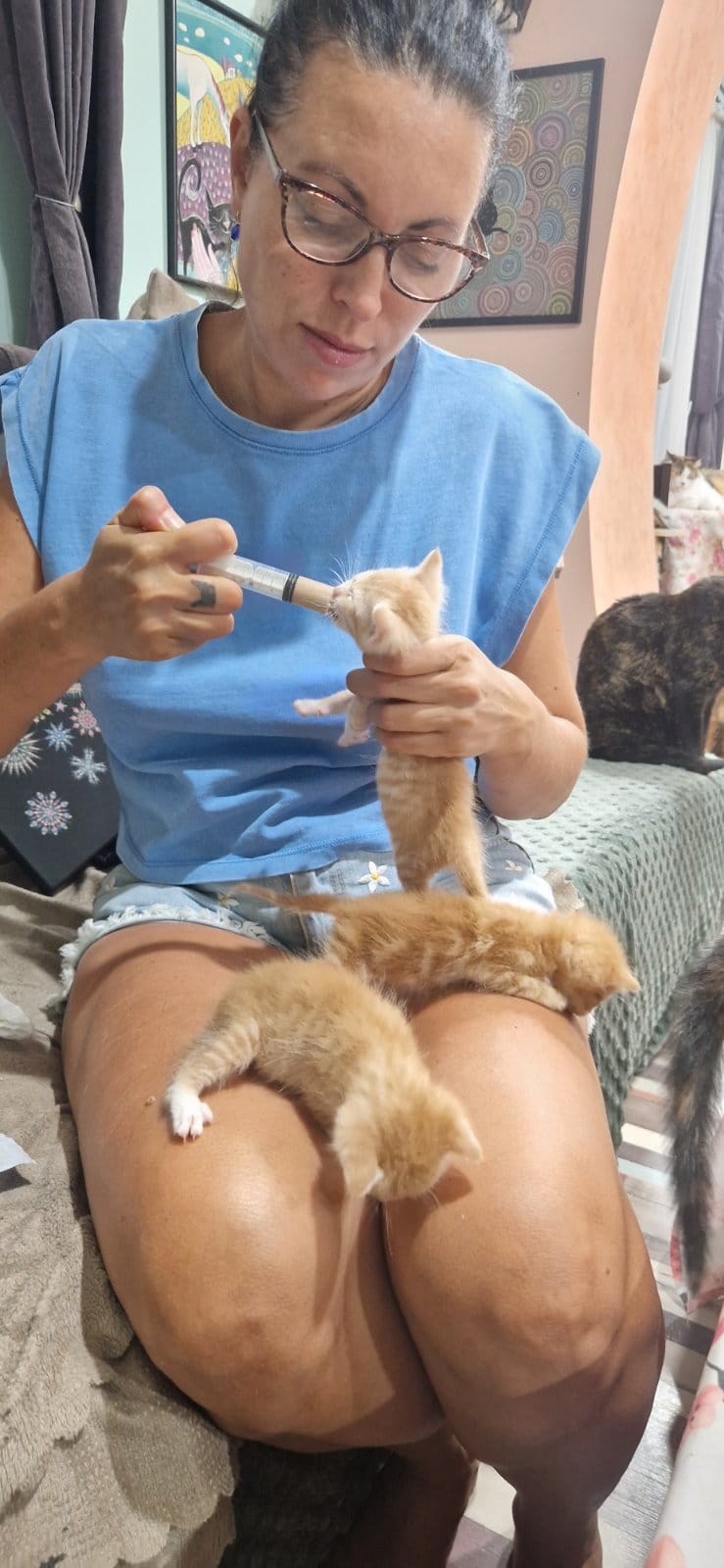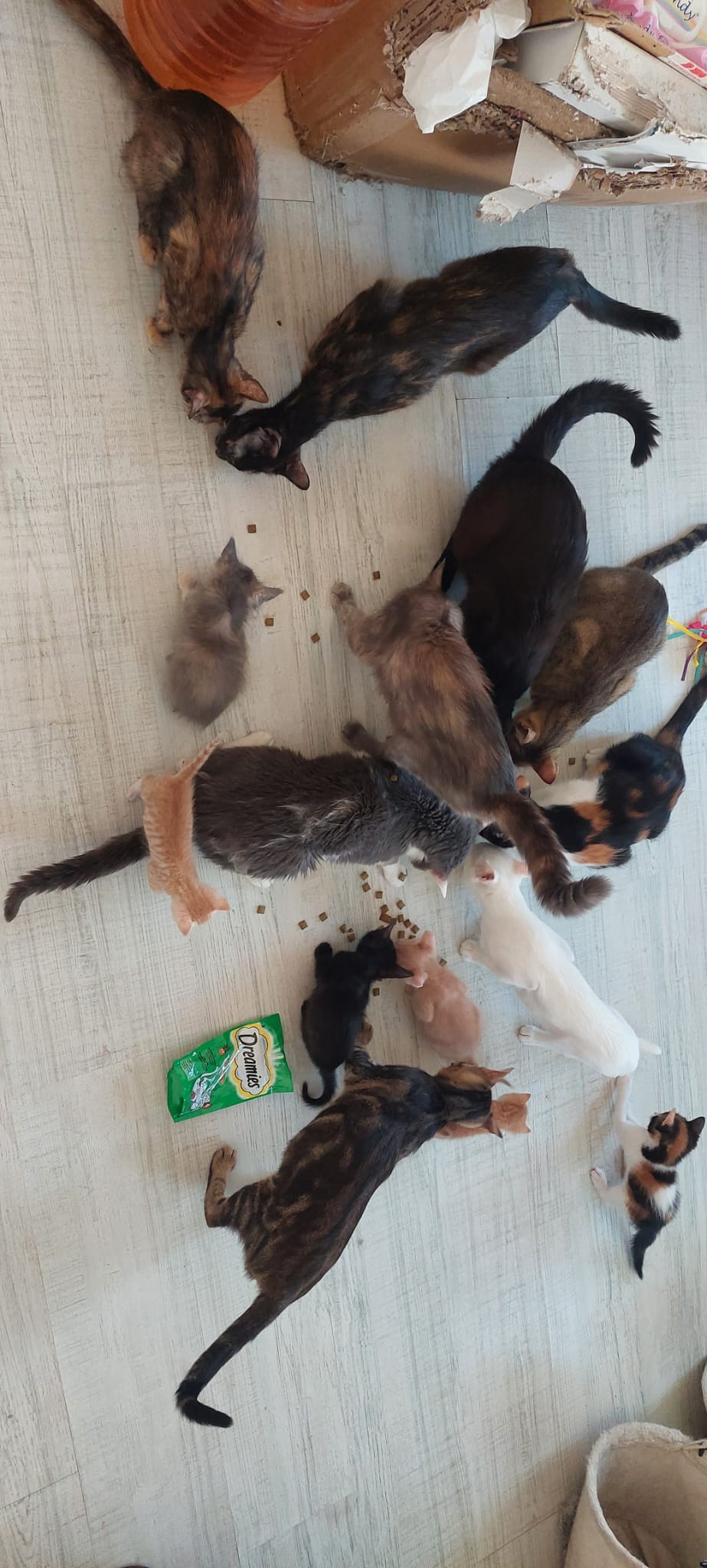 Die Miezen sind halb verhungert, wochenlang nix zu essen, kein reines Wasser, voller Würmer, Parasiten und Wunden, Herpesvirus. Ob sie überleben ist fraglich, aber Pepa kämpft um sie und hofft sie haben noch genug Kraft.