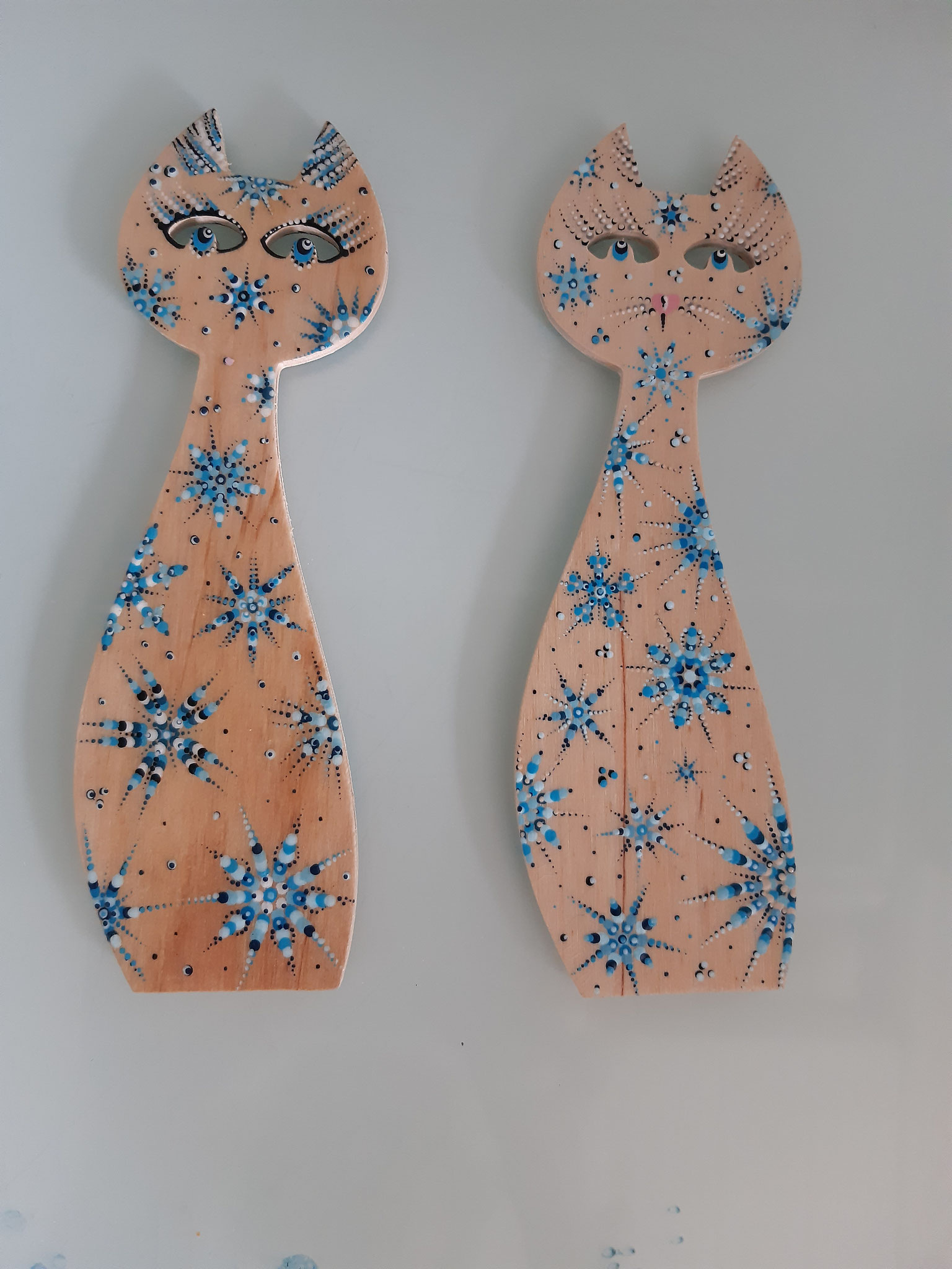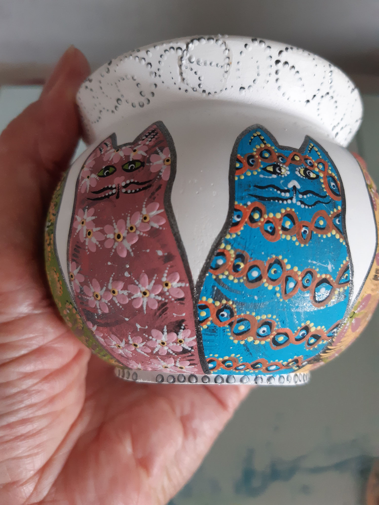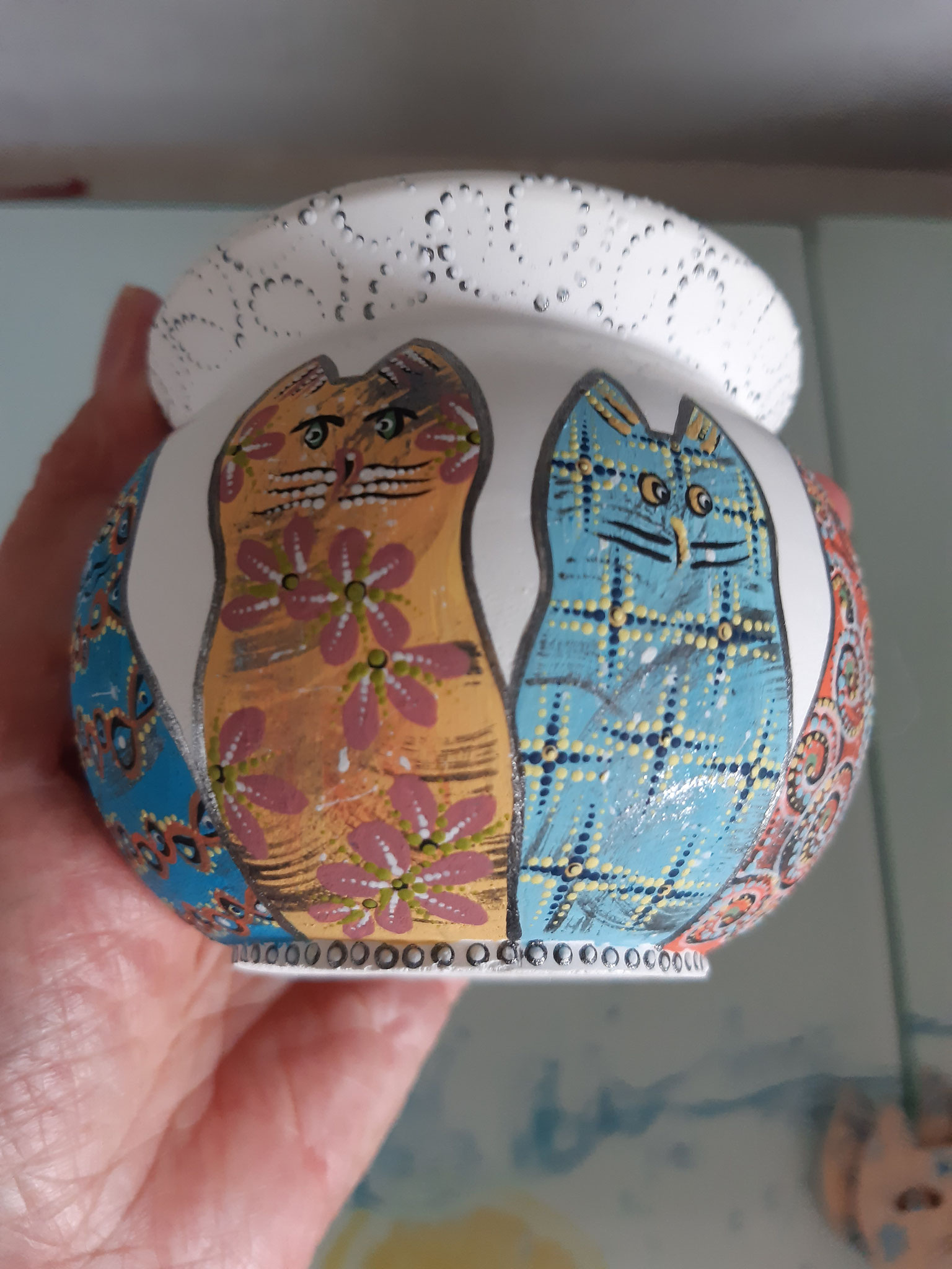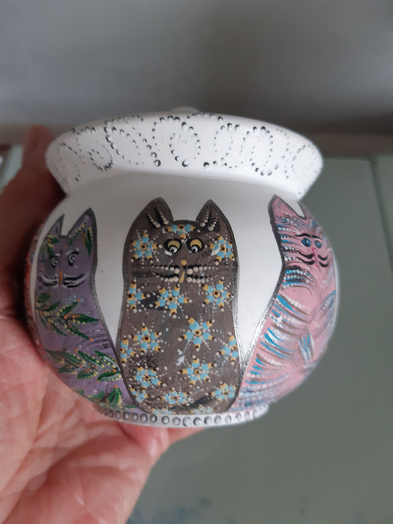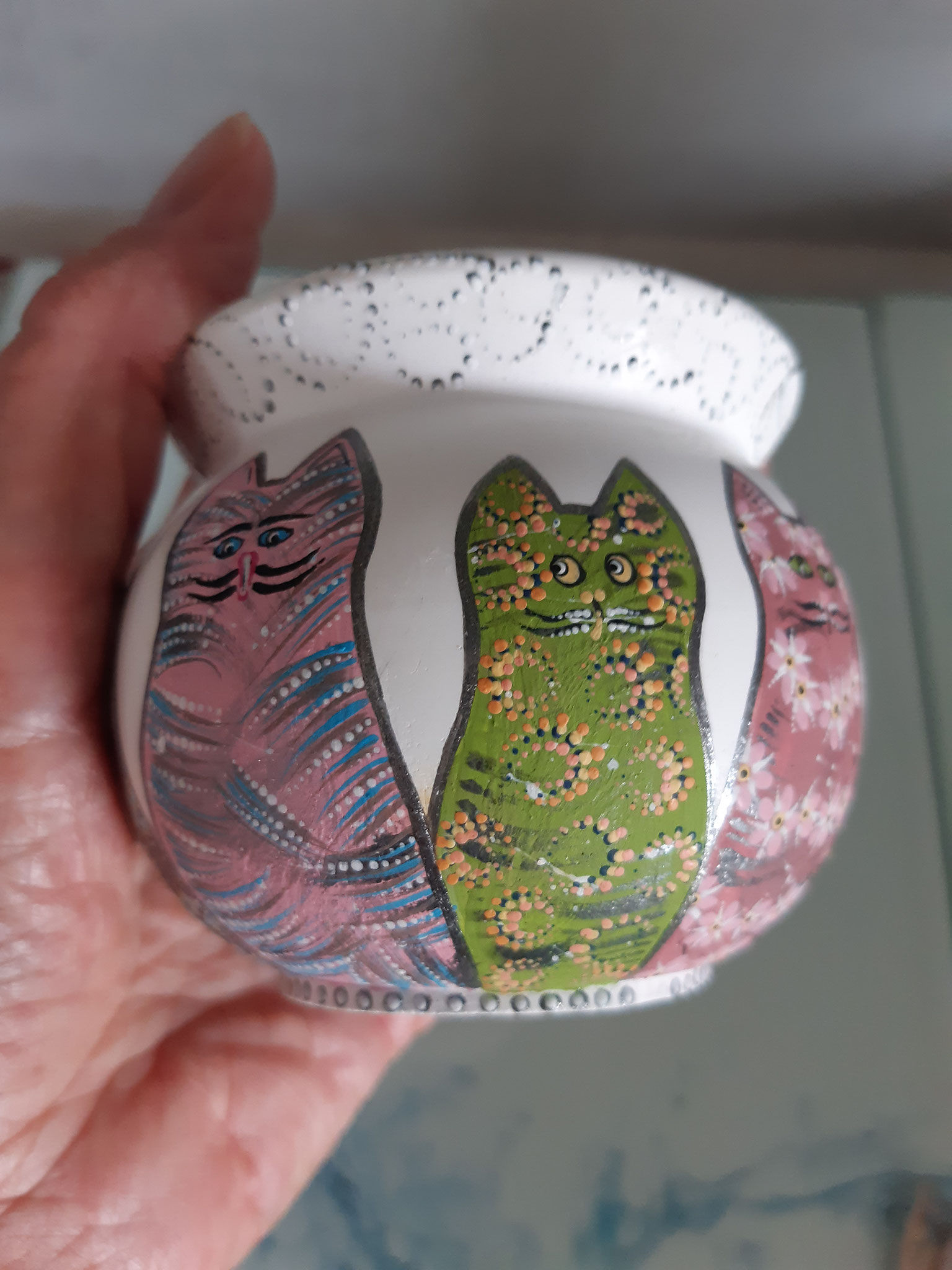 *VERKAUFT* Hausdekoration "Katzenblume", Durchmesser ca. 14 cm, 39 € + Versand 20 € versichert oder weniger unversichert nach DE und Österreich. Oder zusammen mit einem anderen Kunstwerk ... sooo wir haben das hier gepostet in der Annahme es ist ganz aus Holz, was nun kein Thema zum verschicken ist. Nun ist das weisse Oberteil, das Pepa so toll bemalt hat, nicht aus Holz, vermutlich aus Porzellan was es echt unschickbar aus BG macht. Wir denken nach ... also wie wir das herbekommen. Aber weil es so schön ist lassen wir es einfach mal online.